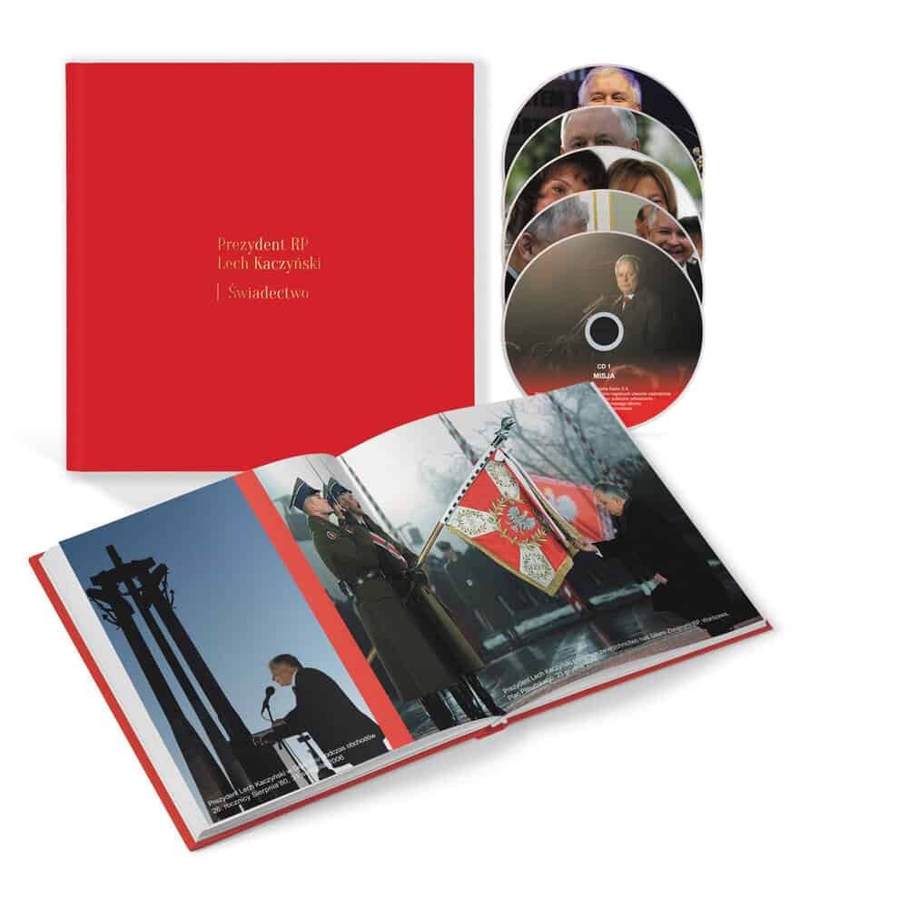 Album pt. „Prezydent RP Lech Kaczyński – Świadectwo”, wydany przez Polskie Radio, jest pełnym fonograficznym kompendium wiedzy na temat prezydentury prof. Lecha Kaczyńskiego. Zamieszczone na pięciu płytach CD archiwalne wypowiedzi Prezydenta (z okresu całego urzędowania) uzupełnia ciekawa i ekskluzywna szata graficzna. Współtworzy ją m.in. przeszło sto fotografii dokumentujących ważne momenty prezydentury śp. Lecha Kaczyńskiego. Album wydany w związku z 10. Rocznicą Katastrofy pod Smoleńskiem, pod patronatem Rady Mediów Narodowych Tracklista: CD 1 - Misja 1. Lech Kaczyński o swoim programie wyborczym (12:23) Fragment audycji Sygnały Dnia nadanej 18 października 2005 r. w Programie I Polskiego Radia, prowadzenie: Krzysztof Grzesiowski 2. Złożenie przysięgi przez Prezydenta elekta Lecha Kaczyńskiego (01:07) Fragment uroczystości zaprzysiężenia Prezydenta RP Lecha Kaczyńskiego, Zgromadzenie Narodowe, 23 grudnia 2005 r. 3. Orędzie Prezydenta RP Lecha Kaczyńskiego (19:55) Fragment uroczystości zaprzysiężenia Prezydenta RP Lecha Kaczyńskiego, Zgromadzenie Narodowe, 23 grudnia 2005 r. 4. Przemówienie Prezydenta RP Lecha Kaczyńskiego (05:47) Fragment uroczystości przekazania Prezydentowi RP insygniów Orderów Orła Białego i Krzyża Wielkiego Orderu Odrodzenia Polski, Zamek Królewski w Warszawie, 23 grudnia 2005 r. 5. Przemówienie Prezydenta RP Lecha Kaczyńskiego z okazji objęcia zwierzchnictwa nad Siłami Zbrojnymi RP (04:07) Fragment transmisji Polskiego Radia z uroczystości na Placu Piłsudskiego w Warszawie, 23 grudnia 2005 r. 6. Pierwsze orędzie noworoczne Prezydenta RP Lecha Kaczyńskiego (09:28) Transmisja Polskiego Radia z Pałacu Prezydenckiego, 31 grudnia 2005 r. 7. Ostatnie orędzie noworoczne Prezydenta RP Lecha Kaczyńskiego (05:19) Transmisja Polskiego Radia z Pałacu Prezydenckiego, 31 grudnia 2009 r. CD 2 - Misja (cd.) 1. Przemówienie powitalne Prezydenta RP Lecha Kaczyńskiego skierowane do Papieża Benedykta XVI podczas pielgrzymki do Polski (11:16) Fragment transmisji Polskiego Radia z Lotniska Chopina w Warszawie, 25 maja 2006 r. 2. Orędzie radiowo-telewizyjne Prezydenta RP Lecha Kaczyńskiego z okazji udanych negocjacji traktatu reformującego funkcjonowanie Unii Europejskiej (04:29) Transmisja Polskiego Radia z Pałacu Prezydenckiego, 17 marca 2008 r. 3. Orędzie radiowo-telewizyjne Prezydenta RP Lecha Kaczyńskiego z okazji podpisania ze Stanami Zjednoczonymi Ameryki Północnej umowy w sprawie instalacji w Polsce elementów tarczy antyrakietowej (05:46) Transmisja Polskiego Radia z Pałacu Prezydenckiego, 19 sierpnia 2008 r. 4. Orędzie okolicznościowe Prezydenta RP Lecha Kaczyńskiego z okazji 5. rocznicy przystąpienia Polski do Unii Europejskiej (04:58) Transmisja Polskiego Radia z Pałacu Prezydenckiego, 30 kwietnia 2009 r. 5. Przemówienie Prezydenta RP Lecha Kaczyńskiego na wiecu w Tbilisi (06:54) Gruzja, 12 sierpnia 2008 r. 6. Rozmowa z Prezydentem RP Lechem Kaczyńskim na temat sytuacji w Gruzji (11:49) Fragment audycji Sygnały Dnia nadanej 14 sierpnia 2008 r. w Programie I Polskiego Radia, prowadzenie: Jacek Karnowski CD 3 – Pamięć / Rodzina Pamięć 1. Przemówienie Lecha Kaczyńskiego, Prezydenta Warszawy, wygłoszone 31 lipca 2004 roku w dniu otwarcia Muzeum Powstania Warszawskiego (12:00) 2. Przemówienie okolicznościowe Prezydenta RP Lecha Kaczyńskiego z okazji Święta Niepodległości (05:52) Fragment transmisji Polskiego Radia z uroczystości przy Grobie Nieznanego Żołnierza, Warszawa, 11 listopada 2006 r. 3. Orędzie radiowo-telewizyjne Prezydenta RP Lecha Kaczyńskiego z okazji 20. rocznicy Wyborów 1989 (04:18) Transmisja Polskiego Radia z Pałacu Prezydenckiego, 5 czerwca 2009 r. 4. Przemówienie Prezydenta RP Lecha Kaczyńskiego - Uroczystości na Westerplatte z okazji siedemdziesiątej rocznicy wybuchu II wojny światowej (18:07) Transmisja Polskiego Radia, 1 września 2009 r. Rodzina 5. Maria i Lech Kaczyńscy o swoim małżeństwie (01:34) Fragment audycji Sygnały Dnia nadanej 17 października 2005 r. w Programie I Polskiego Radia, prowadzenie: Ernest Zozuń 6. Maria i Lech Kaczyńscy o ich córce Marcie (01:38) Fragment audycji Sygnały Dnia nadanej 18 października 2005 r. w Programie I Polskiego Radia, prowadzenie: Ernest Zozuń 7. Maria i Lech Kaczyńscy o życiu w czasach PRL-u (01:46) Fragment audycji Sygnały Dnia nadanej 19 października 2005 r. w Programie I Polskiego Radia, prowadzenie: Ernest Zozuń 8. Maria i Lech Kaczyńscy o pracy i rodzinie (01:39) Fragment audycji Sygnały Dnia nadanej 20 października 2005 r. w Programie I Polskiego Radia, prowadzenie: Ernest Zozuń 9. Maria Kaczyńska o miłości do kwiatów (00:49) Wypowiedź archiwalna wykorzystana w programie specjalnym nadanym w Programie III Polskiego Radia, 12 kwietnia 2010 r. po katastrofie prezydenckiego samolotu Tu-154M w Smoleńsku. CD 4 - Wolność i Solidarność Spotkania przy kominku z Prezydentem Lechem Kaczyńskim – cykl audycji emitowanych od października do listopada 2006 roku w Programie I Polskiego Radia 1. Rozmowa Krzysztofa Czabańskiego z Prezydentem RP Lechem Kaczyńskim – sytuacja polityczna i gospodarcza kraju (23:43) Audycja nadana 13 października 2006 r. w Programie I Polskiego Radia 2. Rozmowa Krzysztofa Czabańskiego z Prezydentem RP Lechem Kaczyńskim – aktualne problemy Polski (18:54) Audycja nadana 27 października 2006 r. w Programie I Polskiego Radia 3. Rozmowa Krzysztofa Czabańskiego z Prezydentem RP Lechem Kaczyńskim – o sytuacji górników w Polsce po katastrofie w kopalni Halemba (20:20) Audycja nadana 24 listopada 2006 r. w Programie I Polskiego Radia CD 5 - Wolność i Solidarność (cd.) Spotkania przy kominku z Prezydentem Lechem Kaczyńskim – cykl audycji emitowanych od grudnia 2006 do czerwca 2007 roku w Programie I Polskiego Radia 1. Rozmowa Magdaleny Mikołajczuk z Prezydentem RP Lechem Kaczyńskim – spotkanie przedświąteczne (22:05) Audycja nadana