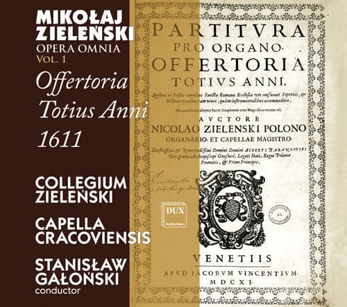MIKOŁAJ ZIELEŃSKI OPERA OMNIA Vol. 1Offertoria Totius Anni 1611 MIKOŁAJ ZIELEŃSKI 1. LAETENTUR CAELI [2:51] 2. DEUS FIRMAVIT [2:57] 3. TUI SUNT CAELI [3:08] 4. ELEGERUNT APOSTOLI [3:17] 5. IUSTUS UT PALMA FLOREBIT [2:30] 6. ANIMA NOSTRA [3:19] 7. INVENI DAVID [3:02] 8. REGES THARSIS [2:33] 9. DESIDERIUM ANIMAE EIUS [3:40]10. TU ES PETRUS [3:51]11. LAETAMINI IN DOMINO [2:44]12. MIHI AUTEM NIMIS [3:23]13. DIFFUSA EST GRATIA [3:03]14. CONSTITUES EOS [3:32]15. VERITAS MEA ET MISERICORDIA [2:51]16. AVE MARIA [4:30]17. TERRA TREMUIT [3:36]18. ANGELUS DOMINI DESCENDIT [2:54]19. INTONUIT DE CAELO [2:55]20. CONFITEBUNTUR CAELI [3:29]21. DEXTERA DOMINI [4:21]22. POSUISTI DOMINE [3:28]23. GLORIA ET DIVITIAE [3:09] Total time [75:01] COLLEGIUM ZIELENSKICAPELLA CRACOVIENSISSTANISŁAW GAŁONSKI - conductor