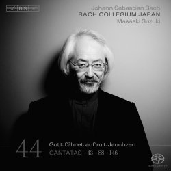 Volume 44 of this universally acclaimed series takes us to Leipzig in the spring and summer of 1726. The two cantatas BWV 146 and 43 were composed for Jubilate Sunday and for Ascension Day respectively, both of them joyous occasions celebrating Christ’s resurrection and subsequent ascension into heaven. In BWV 43 the aspect of celebration is obvious in a scoring that includes trumpets and timpani, lending splendour and emphasis to the jubilant opening, a complex choral fugue. The work also provides each of the four vocal soloists with arias that express different aspects of the mystery of the Ascension. In BWV 146, Bach and his unknown librettist followed the gospel passage for Jubilate Sunday: ‘your sorrow shall be turned into joy’. In consequence, the various movements present jubilation and grief successively, beginning with an instrumental Sinfonia which in spite of its minor key is characterized by a bubbling vitality. Based on a lost violin concerto which also served as the model for one of Bach’s harpsichord concertos, this movement gives a soloistic part to the organ - on this recording the fine Marc Garnier instrument of the Shoin Chapel in Kobe. The organ also plays a prominent part in the following movement, for which Bach again used material from the violin concerto, simply adding the lamenting choral parts to the existing score. In the third cantata on the disc, BWV 88, the subject is the well-known incident of Christ telling Peter to throw out his nets once more after a night of unsuccessful fishing. The soloists in these three works have all appeared before in the series, and the Bach Collegium Japan and Masaaki Suzuki are in the same fine form that inspired the reviewer in the French magazine Classica when writing about Volume 42: ‘an interpretation of incontrovertible eloquence. Suzuki serves Bach in the same manner as the composer served God and his church: humbly, but not without pride.