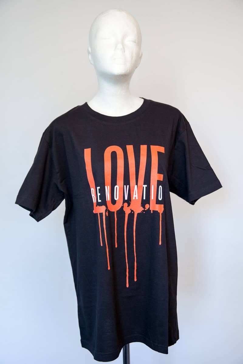 koszulka z nadrukiem promująca płytę Edyty Bartosiewicz "Renovatio". kolor koszulki: Czarny kolor napisu: Czerwony/Biały producent: B&C Collection bawełna: 100% męska rozmiar: XL dostępne rozmiary: M,L, XL
